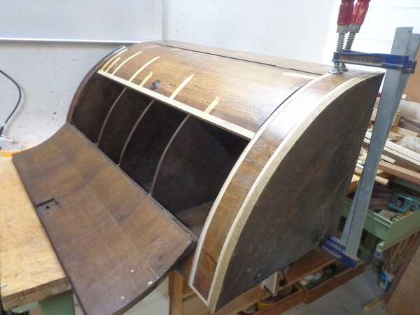 We gaan o.a. beschadigingen en verkleuringen, vooral aan de linkerzijkant, bijwerken. De ingesleten laden nieuwe lopers geven, de panelen in de deuren vastzetten en loszittende delen, vooral in de kap, lijmen. Restaureren doen we "reversibel" dat wil zeggen alles wat we doen kan ook weer ongedaan worden gemaakt.